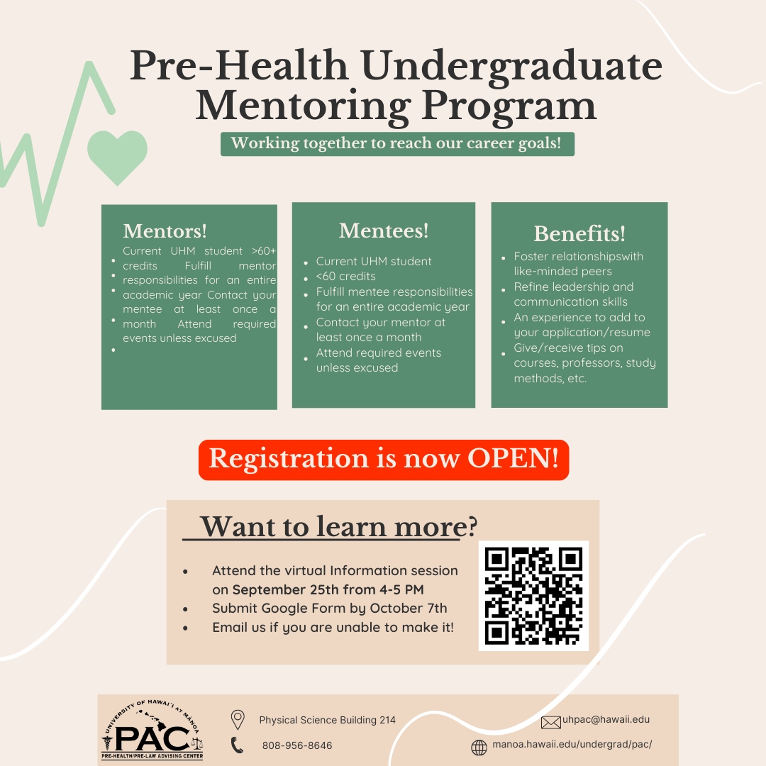 Join PAC’s undergraduate mentoring program at UH Mānoa in which upperclassmen students (60+ credits) mentor lowerclassmen students (<60 credits).